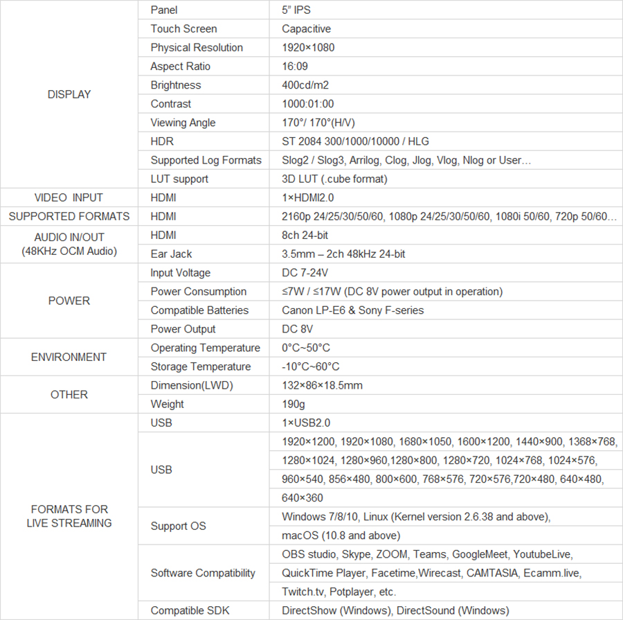 - Dual-purpose battery plate: Sony NP-F, Canon LP-E6; DC 8V output