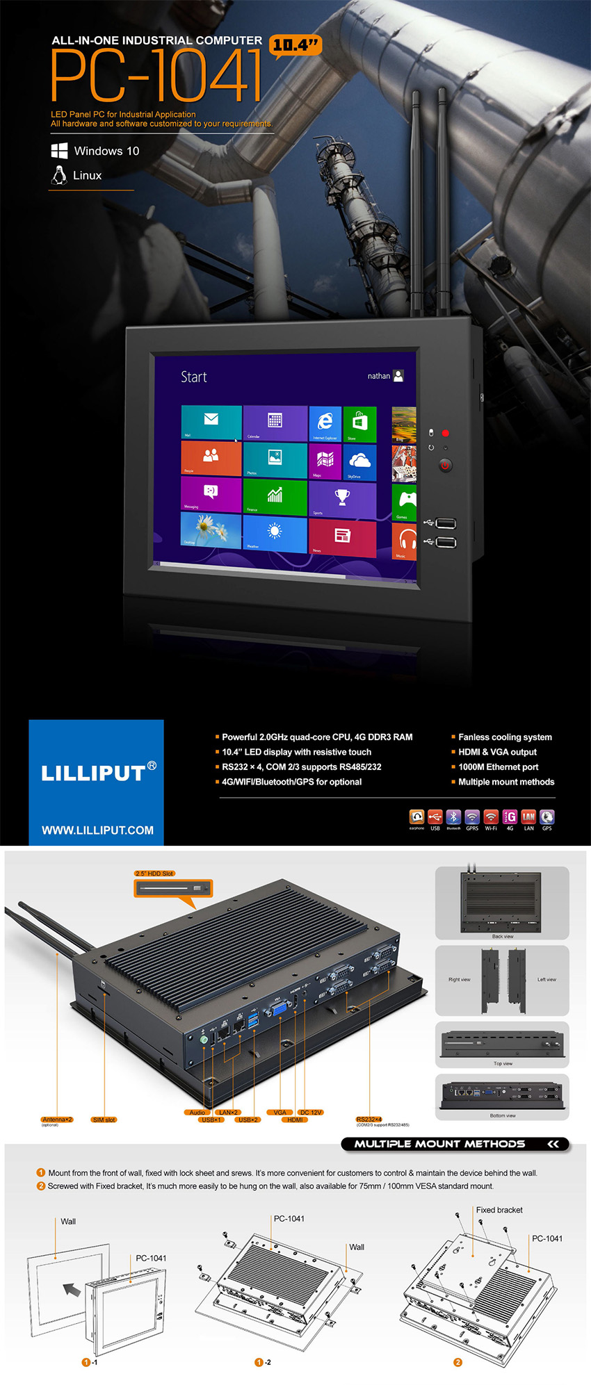 - Interface: RS232×4 (COM2/3 support RS232/485), HDMI out, VGA out, Audio out, DC 12V in, USB2.0×3,USB3. 0 x 2,LAN×2, SIM slot, Antenna x 2
